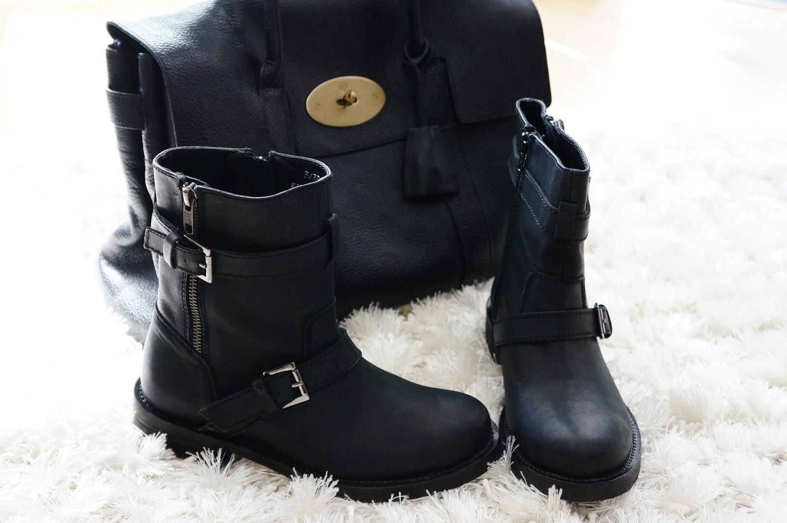 Kuten mainitsin, halusin syksyksi ehdottomasti biker-nilkurit! Metsästin useita nettikauppoja läpi, kun etsin siroja, kohtuuhintaisia, aitonahkaisia nilkkureita. Biker-tyyliset kengät ovat omassa mittapuussani aika rajut, joten en uskalla maksaa maltaita tuotteesta, jos en voi mennä takuuseen, kuinka paljon käyttöä lopulta tulee... Asoksen alepuolelta bongasin kriteerini täyttävät kengät, ja muutaman päivän pohdinnan jälkeen uskaltauduin kengät tilaamaan. Mietin pitkään kahden koon välillä, mutta lopulta päädyin normaali kokooni 36:een. Kenkien tilaaminen on aikamoista arpapeliä, koska eri valmistajien koot voivat vaihdella paljonkin. Onnekseni kengät olivat ihan sopivat, tosin villasukkaa näihin ei todellakaan mahdu. Kokemuksella tiedän myös, että aitonahkaiset kengät venyvät jonkin verran käytössä. Mielestäni uudet nilkkurini ovat sopivan naiselliset, mutta kuitenkin tuovat särmää muuten simppeliin pukeutumiseen.